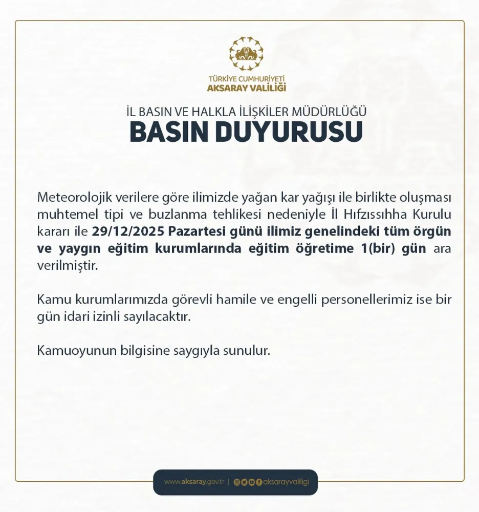 Aksaray’da etkili olan kar yağışı ve buzlanma nedeniyle 29 Aralık 2025 Pazartesi günü il genelinde ilk ve orta dereceli okullarda eğitime bir gün süreyle ara verildi. Karar, Aksaray Valiliği tarafından yapılan açıklamayla duyuruldu.